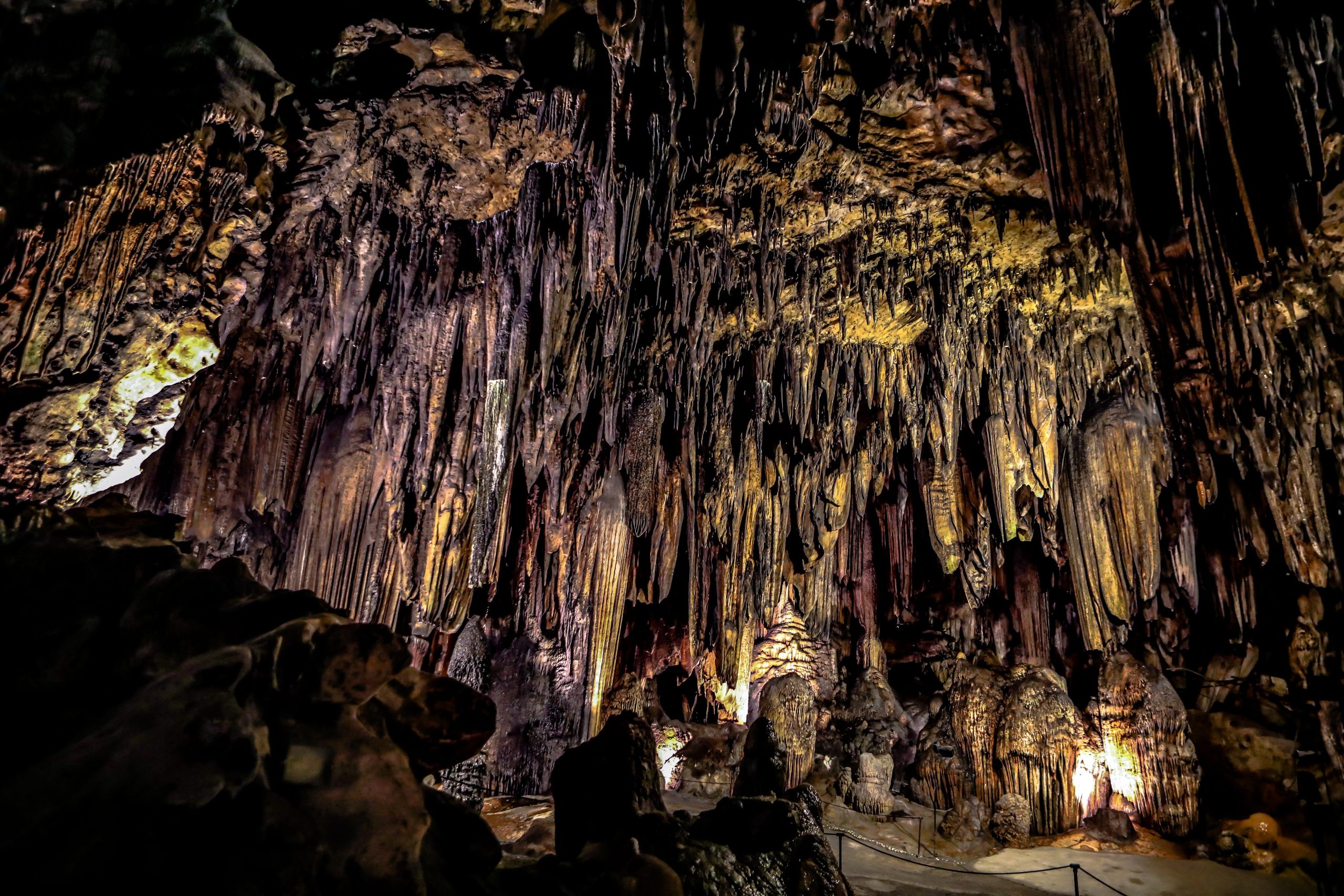 The caverns contain one of the most significant accumulations of gemstone-quality onyx found in a public cave setting, visible throughout the main chambers.