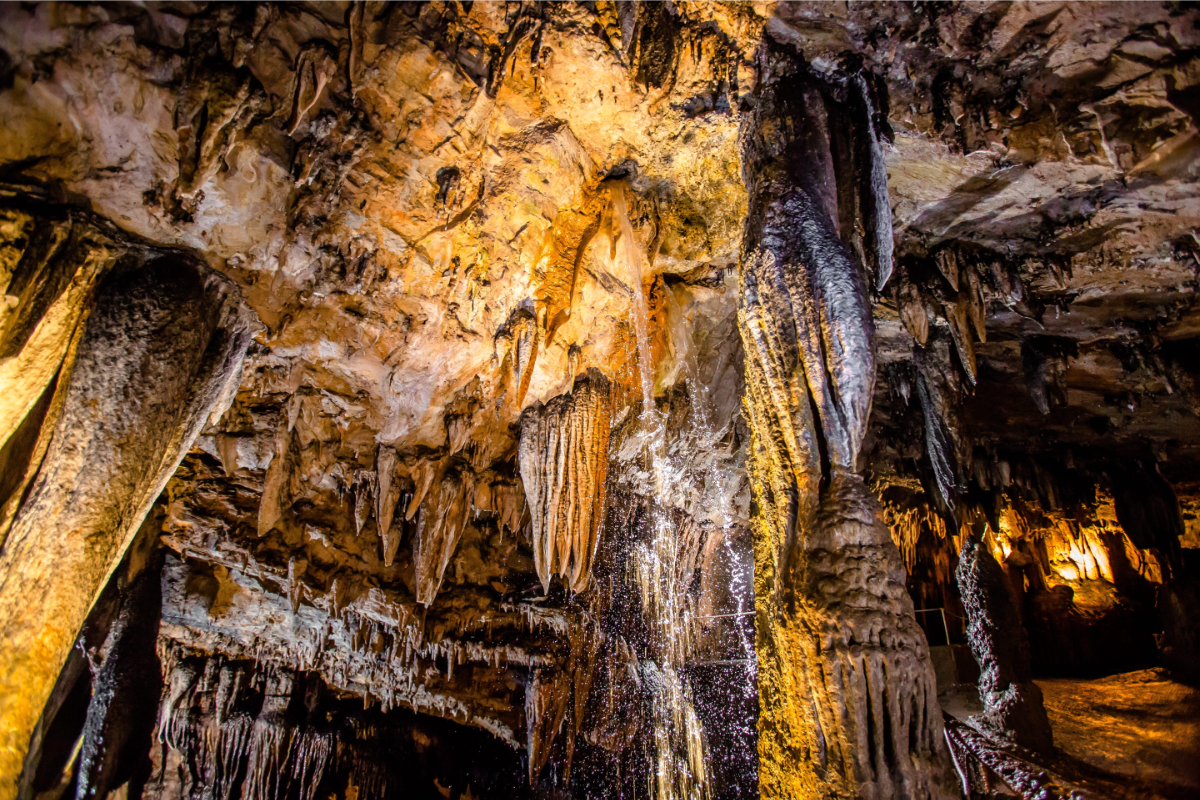 Majestic Caverns formed within ancient carbonate rock that lies beneath the foothills of the Appalachian region.